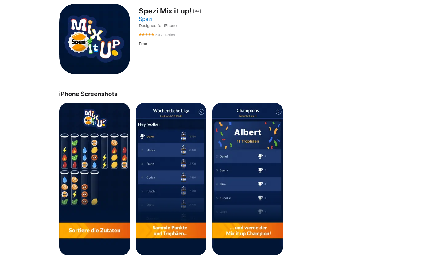 Spezi Mix it up! adalah permainan di mana Anda ditantang untuk mengatasi kekacauan dalam tabung-tabung yang berisi berbagai bahan. Tujuan Anda adalah menyortir bahan-bahan tersebut sehingga setiap tabung hanya berisi satu jenis bahan. Meskipun tampak mudah pada awalnya, tingkat kesulitan akan meningkat seiring berjalannya permainan. Setiap minggu, Anda dapat bersaing dengan pemain lain dan berusaha menjadi juara Mix it up!
